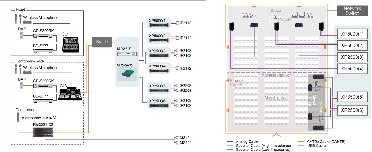 This hall can be used in its entirety or partitioned for conferences, seminars, lectures, panel discussions, and other events, with a Dante network for audio communication. When the entire hall is used either the CL3 digital mixing console in the control room or the QL1 digital mixing console in the hall area can be used. When the hall is partitioned the QL1 is used for the stage-end division while the CL3 is used for the remaining division.