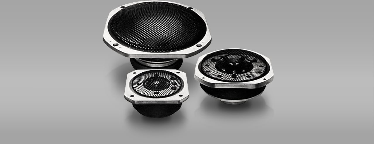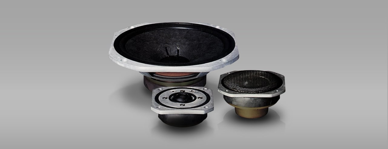Yamaha’s first two soft-dome drivers designed from scratch — the JA-0701 7.5 cm (3") midrange (pictured front right) and the JA-0509 3 cm (1-1/8") tweeter (front left) — found their way into the NS-690. Their naturally extended frequency response and low distortion as well as broad directionality gave the NS-690 the unique characteristics of a natural-sounding speaker capable of delivering excellent resolution of detail and realism. The diaphragm materials originally developed for the NS-690 continued to be refined and used for almost all of Yamaha’s later soft-dome drivers and for edges on the NS-1000M's JA-3058A woofer and many other woofers as well as on the DC diaphragm tweeters (hard dome) found in our speakers released in the 2000s. Meanwhile, the NS-1 Classic introduced in 1988 had, for the first time, a soft dome made of undyed cotton treated with a minimum amount of resin needed to maintain the diaphragm shape, eliminating the need for dual-layer coating of form-stabilising resin and viscoelastic resin.