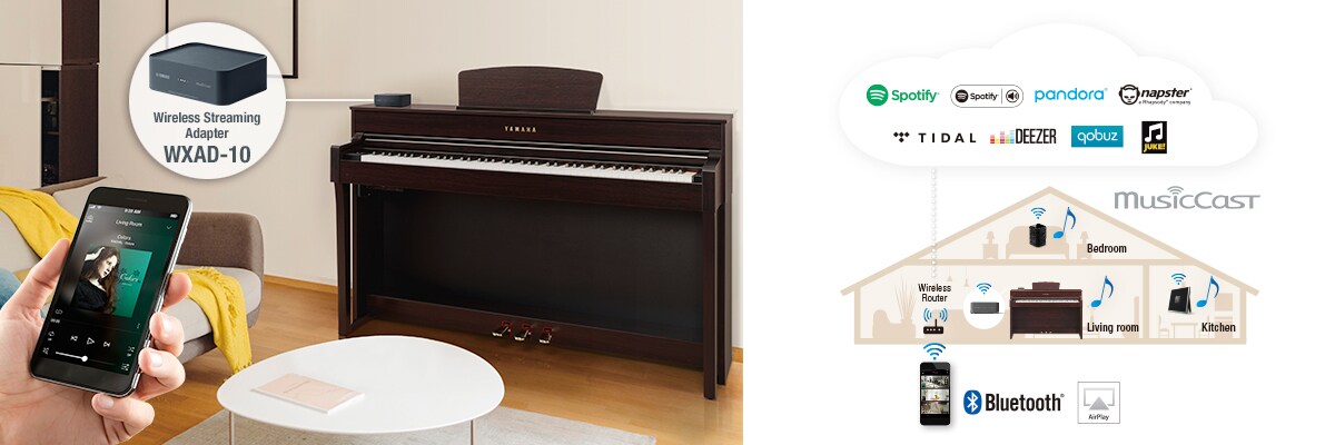 By connecting the WXAD-10, Yamaha's famed Clavinova digital piano will be reborn as a network streaming speaker. You can play smartphone sound sources wirelessly and listen to various streaming services easily from your Clavinova. Moreover, it supports Yamaha's unique wireless music system MusicCast, allowing you to enjoy background music freely throughout your house, in any room. Easily play streaming services using the convenient smartphone App, and play along on the piano with your favourite songs — and enjoy even more fun and expanded possibilities with the Clavinova.