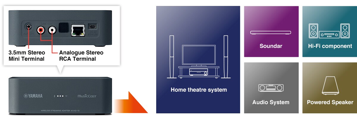 Equipped with RCA and stereo mini output terminals, the WXAD-10 can be connected to a wide range of audio products — whatever components you currently have. Use it with a shelf stereo system, Hi-Fi component, home theatre system, or even a soundbar. The possibilities are endless.