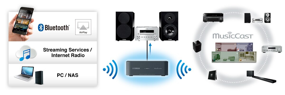 Bare koble WXAD-10 til dit nåværende lydsystem, og gjør hele systemet smart! Trådløs musikkavspilling med Bluetooth® og Airplay®, musikk streaming-tjenester, og mer kan nå nytes - som aldri før. Den er også kompatibel med Yamahas trådløse musikksystem MusicCast, slik at du kan legge til dine audiokomponenter til en verden av MusicCast og utvide dine musikklyttemuligheter. WXAD-10 bringer intelligente nye funksjoner i ditt nåværende systemet og virkelig gjør det ‘smart’ med alle de nyeste, praktiske funksjoner.