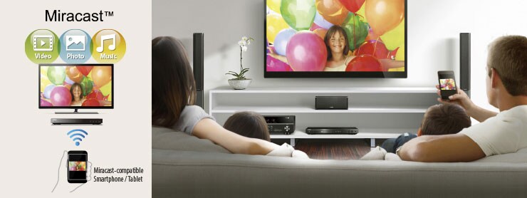 Denne Blu-ray Disc-spilleren er kompatibel med Miracast, en trådløs standard som lar deg koble Miracast-kompatibel smarttelefon eller nettbrett for speiling av videoer og bilder til spilleren, slik at hele familien kan se dem på TVen. Når du bruker en Yamaha AV-receiver, vil du kunne nyte en rekke medier speilet via Miracast med fantastisk lyd.