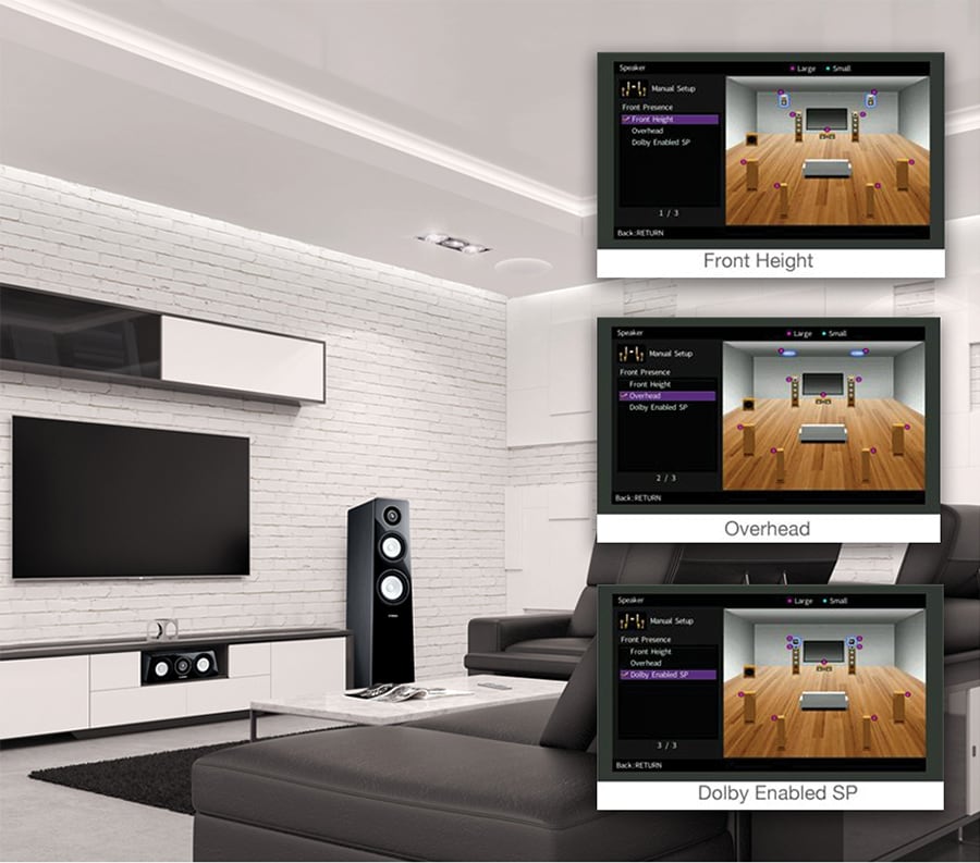 Yamaha har flere plasseringsmønstre for tilstedeværelseshøyttalere som støtter Dolby Atmos – for å skape det perfekte lydfeltet som vil være ideelt for din konfigurasjon.