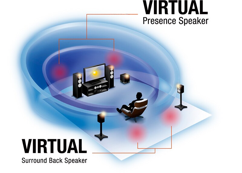 CINEMA DSP 3D har kreftene som trengs for å utnytte Virtual Presence-høyttalerfunksjonen fullt ut, slik at senter- og surround høyttalerne brukes til å gi lydinformasjon fra området hvor høydehøyttalere normalt er plassert. I tillegg har denne modellen også en Virtual Surround-funksjon for de bakre høyttalernes lydfelt. Selv uten å bruke bakre surround høyttalere kan du oppleve mer naturlig surroundlyd takket være CINEMA DSP 3D-avspilling – noe som gir deg den virtuelle opplevelsen som tilsvarer opptil 9.1-kanals surroundlyd selv med en 5.1-kanals høyttalerkonfigurasjon.