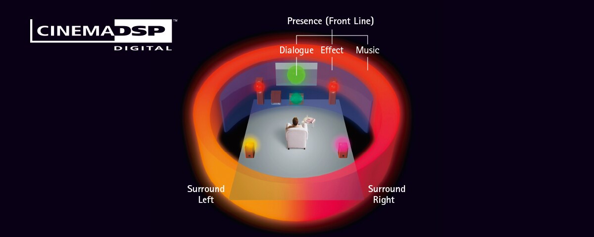 Even when it is impossible to install surround speakers behind the listening position, Virtual CINEMA DSP reproduces virtual 5-channel surround sound filled with realism, with only two front speakers. With Virtual CINEMA FRONT, you will enjoy virtual 5-channel surround sound with higher quality and resolution by installing surround speakers at the front. You get more flexibility to arrange your speakers inside the room, along with easy enjoyment of high quality surround sound.