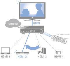 Når AV-receiveren er i HDMI Standby Through-modus kan inngangskilden (for eksempel Blu-ray ™ Disc-spiller eller spillekonsoll) byttes ved hjelp av fjernkontrollen. Man behøver ikke skru på receiveren for å bytte kilde.