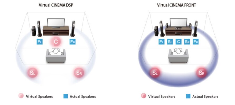 Iblandt er det omstendig eller kanskje til og med umulig å installere surroundhøyttalere bak lyttepossisjon. Rolig, vi har løsningen. Med Virtual CINEMA DSP skapes en virtuell 5-kanals surroundlyd, med bare to fronthøyttalere. Med Virtual CINEMA FRONT, kan du nyte en virtuell 5-kanals surroundlyd med høyere kvalitet og med imponerende oppløsning og detaljerikdom gjennom å installere surroundhøyttalere framfor deg istedenfor bakom. Du får med Virtual CINEMA DSP større flexibilitet til å plassere høyttalerene. Så om du vil slippe å dra høyttalerkabel rundt om i rommet, med Yamaha Virtual CINEMA DSP får du en høykvalitativ surroundlyd uansett hvilket plasseringgsalternativ du velger.