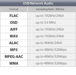 Denna AV-receiver är kompatibel med många ljudformat som Dolby True HD och DTS-HD Master Audio. Vill du lyssna på högupplöst musik finns stöd för DSD / AIFF / FLAC / WAV / Apple Lossless. Du kommer kunna njuta av flera högupplösa format när du spelar upp från USB eller nätverk