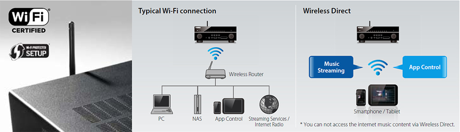 Inbyggd Wi-Fi ger möjlighet till en trådlös anslutning till en router. Det gör det smidigare att komma åt och ta del av musik från nätverket eller från internet streamingtjärnster. Om det inte finns någon Wi-Fi-router går det med Wireless Direct att upprätta en trådlös länk direkt mellan din smartphone och receivern. Med Wireless Direct kan du trådlöst skicka över musik direkt från din smartphone eller surfplatta med MusicPlay eller Airplay. Du kan då spela upp musiken på receivern, utan att behöva ha ett nätverk eller någon kabel. Du kan dessutom kontrollera receivern via AV Controller Appen som finns att ladda ner gratis för iOS och Android enheter.