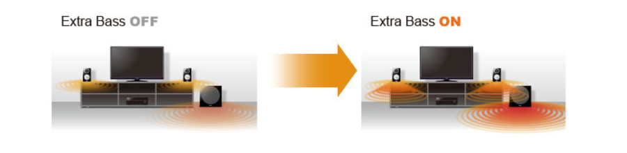 Yamahas exklusive forbedringsteknikk for lave frekvenser. Med Extra Bass får du uansett høyttalerstørrelse ut edre bassgjengivning en du vanligvis får ut og forventer deg fra ditt system. Extra Bass gir bra lokalisering og sunn balanse selv om du bruker kompakte fronthøyttalere. Funksjonen er enkel å aktivere (knapp på fjernkontrollen) og fungerer uavhengig av om du bruker subwoofer eller ikke. Med Extra Bass kan du nyte video og musik med lyd som har eksepsjonell kraft og nærvær.