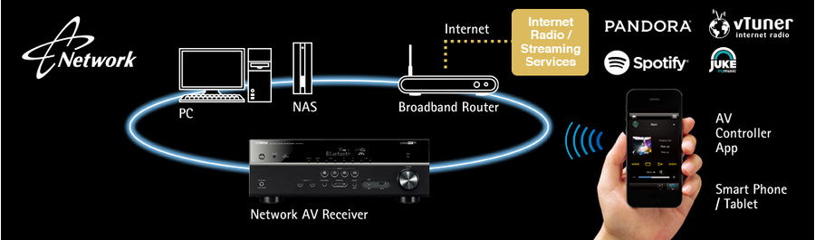 Du får en mängd intressanta nätverksfunktioner som gör att du enkelt och smidigt kan kan komma åt fler ljudkällor. Du kan ansluta receivern till en dator och spela upp musikfiler som ligger lagrade på den. Du kommer även åt ett stort utbud av musik genom Internet Radio eller Spotify. Ladda ner AV Controller app (från iTunes App Store eller Goggle Play). Med denna app kan du styra olika funktioner på receivern från din iPod, iPhone, iPad eller Android telefon/tablet. AV Controller är gratis att ladda ner.