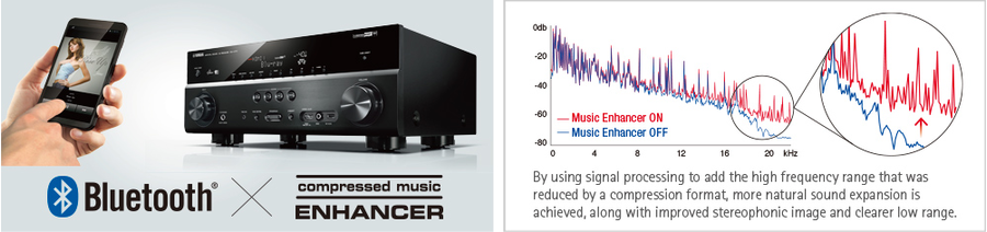 Denne hjemmekinoreceiveren er utstyrt med Bluetooth funskjonalitet. Det gir deg en smidig trådløs mulighet til overføring fra f.eks. smarttelefoner, tablets eller PC. Yamaha Compressed Music Enhancer er nå optimalisert for Bluetooth. Det gjør at din musikk spilles med mer dynamik og liv enn det du normalt hører fra komprimert Bluetooth lyd.