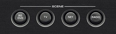 Pressing a SCENE button powers on the AV receiver and selects the input source and DSP mode. You can re-set the buttons for different sources by selecting a source and DSP mode, then pressing a SCENE button for more than three seconds.