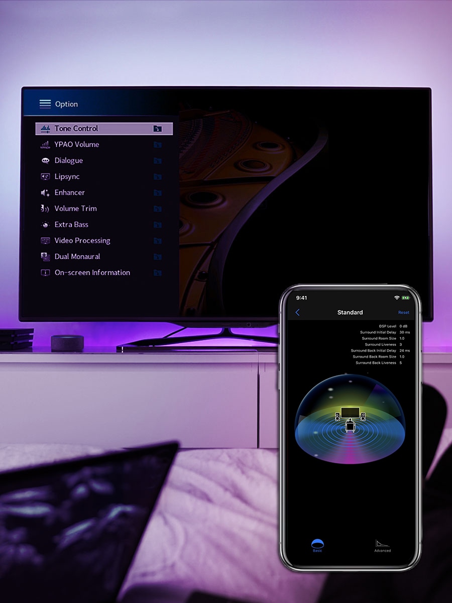 YPAO R.S.C.-funksjonen analyserer romakustikken, måler høyttalernes egenskaper og kalibrerer deretter lydparametere for å oppnå optimal lydkvalitet. Den har Reflected Sound Control-funksjon som retter tidlige refleksjoner for å oppnå lyd av studio kvalitet. I tillegg har den DSP Effect Normalisation, som justerer CINEMA DSP-parametrene etter den reflekterte lyden. Det er som å få anlegget ditt kalibrert av en profesjonell installatør som gir deg et ideelt lydbilde med perfekt balansert lyd.