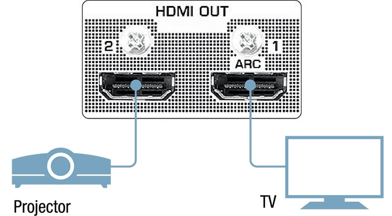 Siden RX-V685 har to HDMI-utganger, kan du koble den til TV-skjerm og LCD-projektoren samtidig. Dermed kan du bruke TV-skjermen som vanlig, og bruke projektoren til favorittfilmene dine og spesielle programmer – enkelt og uten at du slipper å bytte tilkoblinger. Den innebygde HDMI-funksjonaliteten samsvarer med de siste spesifikasjonene, noe som betyr HDR (Dolby Vision-kompatibel, Hybrid Log-Gamma), 4K/60p-passthrough, 4K-oppskalering og så videre.