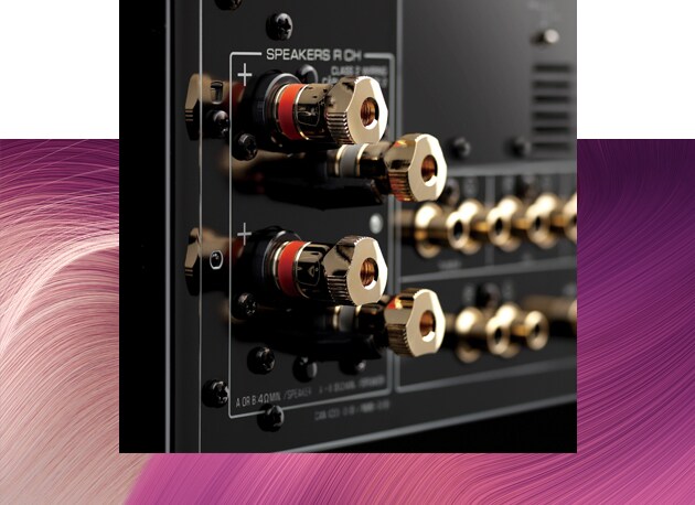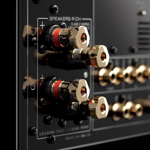 De luksuriøse høyttalerterminalene er skåret ut i ren messing og gir en svært sikker tilkobling som enkelt kan strammes for hånd.