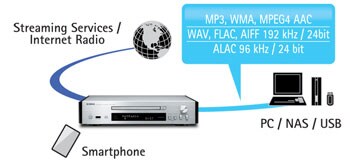 Dette produkt er utstyrt med nettverk, en funksjon for at du lettere skal få tilgang til din favorittmusikk. Uansett om du velger å lytte på streamingtjenester eller NAS (Nettverk harddisk) eller din personlige pc's musikkbibliotek. Du får tilgang til internett radiosendinger og velg dine favorittradiostasjoner på vTuner-som gir enkel tilgang til radiostasjoner rundt i verden, akkurat som om du lytter på DAB og FM-sending. Den spiller av høyoppløste WAV / FLAC / AIFF 192kHz / 24-bit musikkfiler. Den har dessuten en USB-port på frontpanelen og kan kobles til AirPlay for å ubegrenset øke din verden av musikk. Du får alt i en og samme enhet.