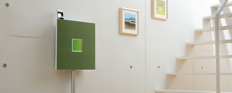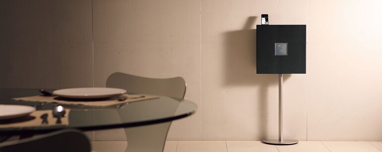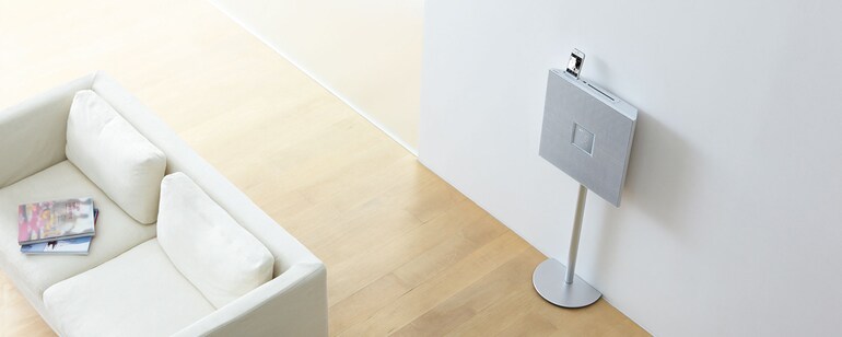 Med en enhet som bare er 9 cm dyp og et halvmåneformet stativ kan du plassere Restio helt inn mot veggen. Den frittstående stilen krever heller ingen hylle, så den kan plasseres helt uten begrensinger. Du kan også fjerne stativet og henge enheten på veggen (dette krever tilleggsbraketten AT-800). Den perfekte måten å matche musikkilden til interiøret i rommet.