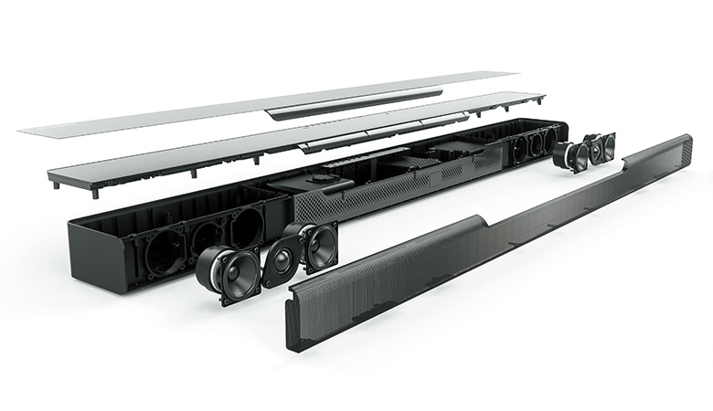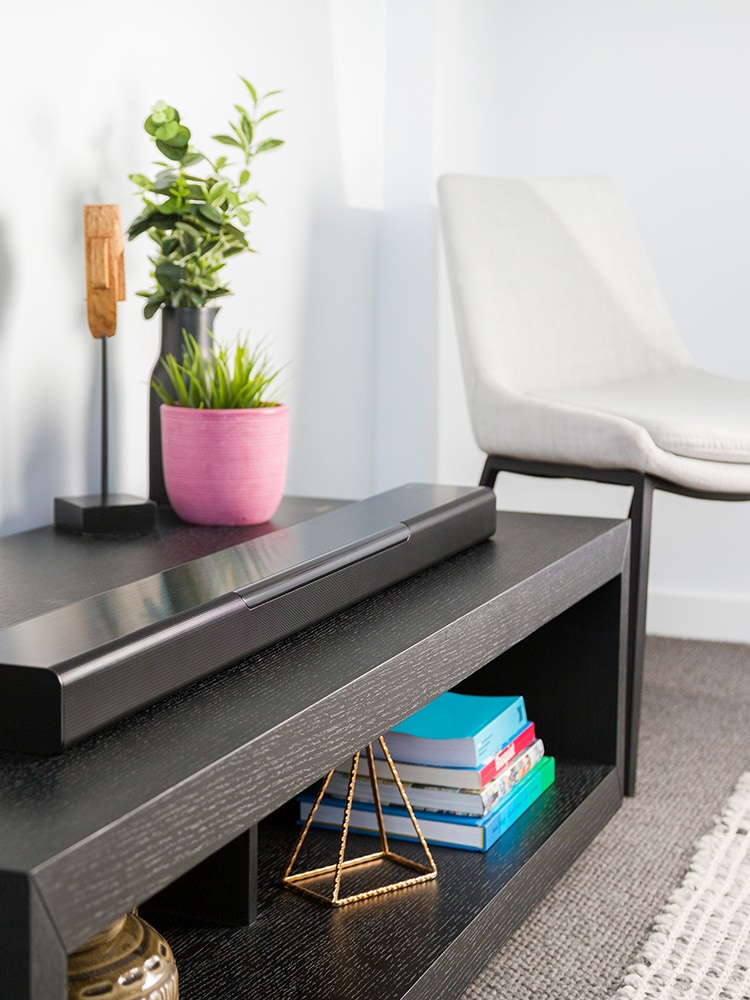 Den slanke profilen gjør det mulig med en diskré plassering foran TV-skjermen uten å forstyrre seeropplevelsen.