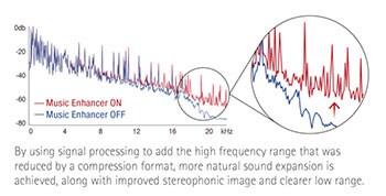 The Compressed Music Enhancer restores frequency response lost during digital compression, so your music sounds the way it should. It is optimised for Bluetooth audio transmission for vivid, lively sound quality during wireless playback. The function engages automatically when a compressed source is played.