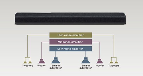The YAS-706’s centre unit soundbar features triple amplifier drive with separate amps for treble, mid and bass. These dedicated amps reduce interference, achieving clear sound that’s easy to listen to.