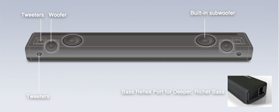 - Built-in subwoofer x 2, bass reflex port x 2 for deeper bass (Centre unit)