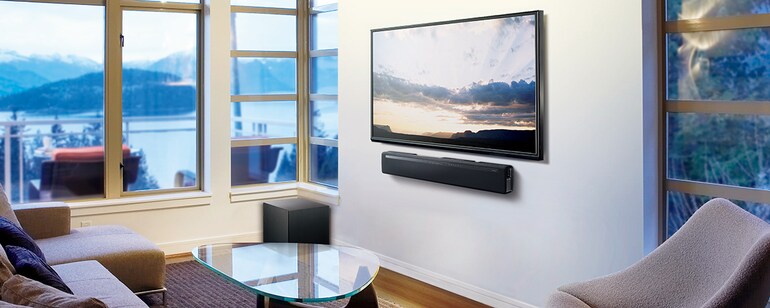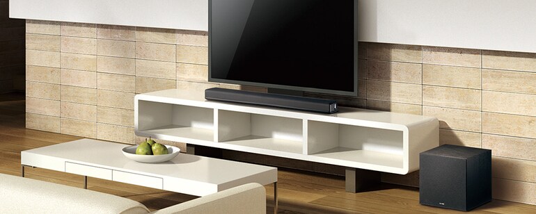 The rounded form and black chrome side plating ensure that this will be a stylish addition to your interior. The centre unit can be placed on a shelf or hung on a wall, whichever style you prefer. Along with the simple-design subwoofer, the YAS-706 fits neatly into your room.