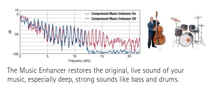 Når musikk kodes til digitalt komprimerte filer som MP3, går det ut over frekvensresponsen. Music Enhancer gjenoppretter det som gikk tapt i komprimeringen, slik at musikken låter slik den er ment å låte.
