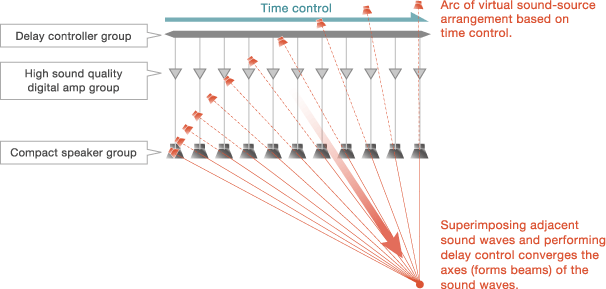 Superimposing sound waves from the compact speakers installed in a row and adjusting their direction by delay control causes the axes of the sound waves to converge in a specified direction.