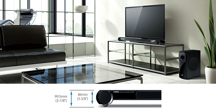 Only 86mm high, the YSP-4300 can easily be placed in front of your TV without blocking the screen. The height can be adjusted in two levels by adding the spacers. It is also wall mountable (brackets optionally available).