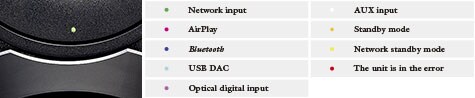 På framsidan av högtalaren ger en LED-display indikatori olika färger dig information om driftstatus: organge för ECO standbyläge, grönt för nätverksfunktion, rosa för AirPlay och himmelsblå för USB DAC.