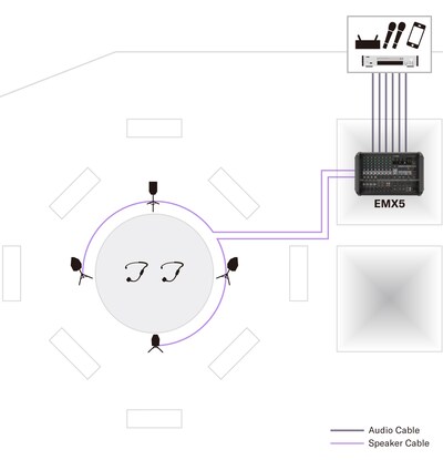 - The system consists of a powered mixer and 4 x passive speakers.