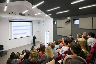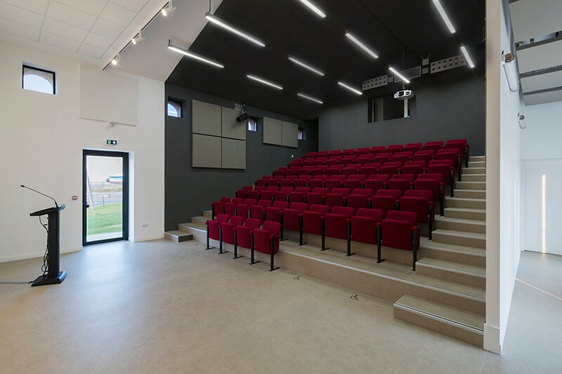 The amphithéâtre (lecture theatre) features four VXS8 loudspeakers and an XMV4140 amplifier, while the meeting room includes four more VXS8 and two VXS5s, powered by an XMV8280 amplifier, both systems for presentations and video soundtracks.
