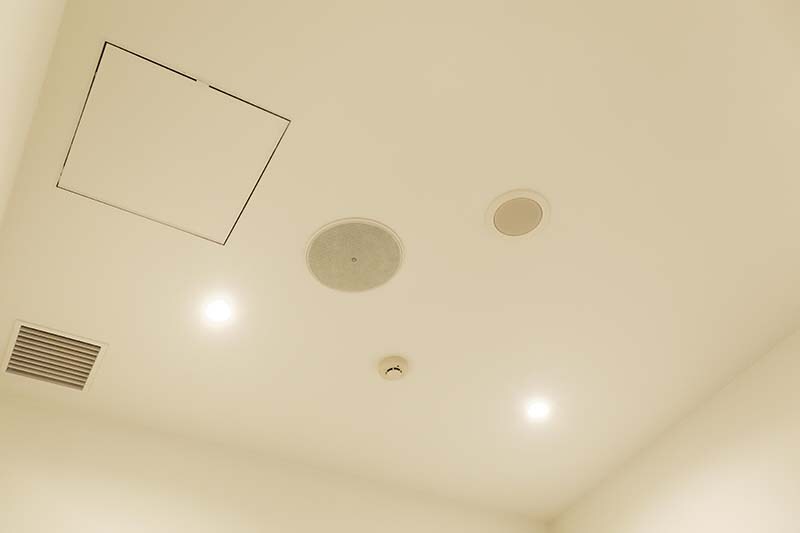 A total of 21 Yamaha VXS5W speakers are installed in the ceiling, assigned to three zones: entrance, a row in front of the video monitor, and the rear area. This allows optimum volume to be set for each zone. The speakers in front of the large monitor deliver sound for video content shown, while the others handle background music. Two VXS10SW subwoofers are also installed in locations that are not visible to guests. Five VXC4W ceiling speakers are installed in the office and restroom.