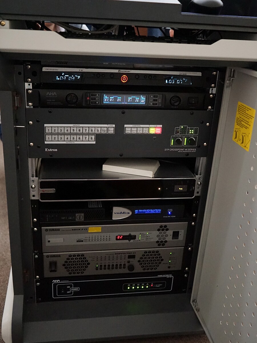 Audio inputs to the system in each room come from a lectern microphone, two wireless microphones, an Aux input for extra local sources and the Extron system, for remotely-streamed content from INHA University of Korea.