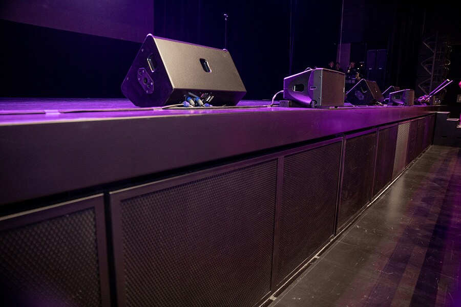The system, designed to be highly efficient and energetic enough for a rock music venue, consists of seven per side STM M46 main modules and seven STM B112 bass units, hung two-deep. Two STM M28 omni purpose modules are suspended from each cluster to provide down fill, and 18 STM S118 subwoofers have been arrayed along the front of the stage to ensure even low frequency coverage. P12 and PS15 are used for stage monitors. The system is driven by 21 NEXO NXAMP4x4 4-channel Powered TD Controller fitted with NXDT104 Mk2 Dante audio network cards, providing a total of 84 amp channels. Side fills consist of four NEXO GEO S1210 cabinets and four LS18 subwoofers, with four GEO M1012s for front fill.