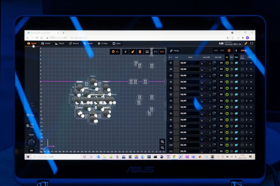 For the second of Yorunoyo, I created music with AFC Image from the beginning. I moved the sound image further in accordance with the concept of “FLOW - Going Around”. I thought about three-dimensional localization and speaker placement from the composition stage, for example, “Let's swing to L here,” or “Let's move the violin sound in this way in the space,” and so on. The PANs and other components of AFC Image responded to the music in a straightforward manner, making it easy to create a three-dimensional sound image. I wanted to create the music on a grand scale, so it was beneficial that the number of AFC objects was increased from the previous event to a maximum of 128 channels. This time, we have more than 120 channels for sound sources including quartet recordings, digital music, and ambient microphones, which were combined into 80 channels by stemming. After actually playing it back in the Cross Dome, we made some minor adjustments, such as adding a kick and separating the violin track to give it more breadth.