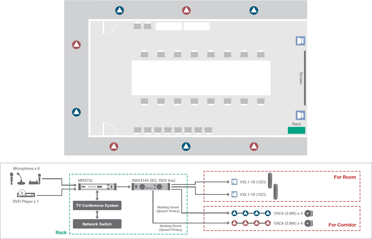 These capabilities are vital in modern offices, financial institutions, medical facilities, and more. The system described here is a good start. Although remote conferencing is a rapidly growing mode of communication, echoes caused by audio feedback and otherwise impaired intelligibility are still common problems. Yamaha’s highly advanced MRX7-D features an Acoustic Echo Canceller function that effectively suppresses echoes even if speaker output is picked up by microphones in the room, eliminating echoes and dropouts in both directions. Add VXL1 slim line array speakers that offer outstanding clarity, and you have a system that achieves excellent intelligibility for smooth, effortless communication. The MRX7-D also includes a Speech Privacy function that feeds a special masking signal to speakers installed in the hallway outside the conference room, making it impossible for outsiders to eavesdrop on the proceedings.