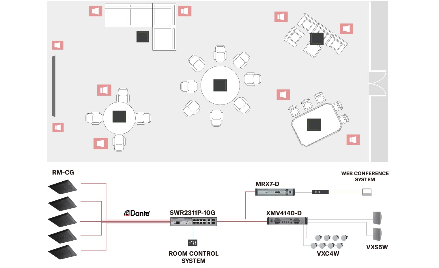 If you want to use a large room in a variable way, a customised solution is the best choice, combining 5 RM-CG ceiling microphones with a MRX7-D matrix processor and a XMV-4140D amplifier to a very variable solution.