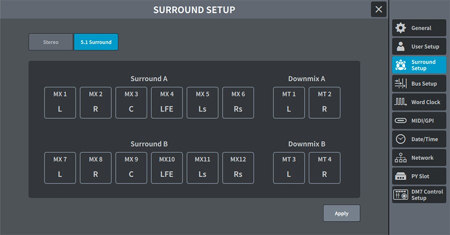The latest DM7 Version 1.60 firmware brings remote control to AFC Image, Yamaha’s object-based immersive system, creating efficient workflows for immersive audio experiences in the live environment. It also adds 5.1 surround panning and monitoring to the DM7’s Broadcast package expansion.