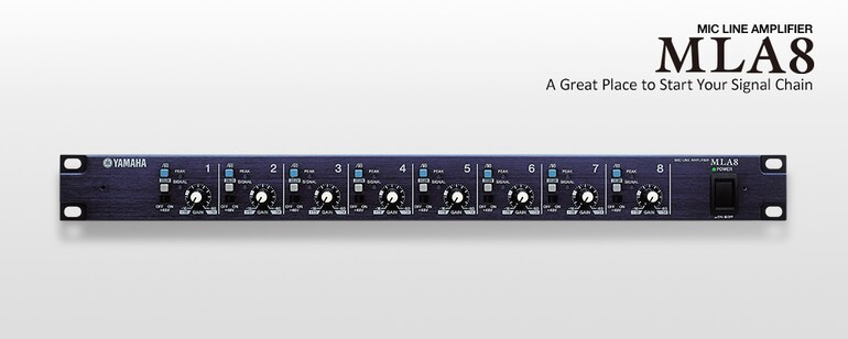 The MLA8 is an eight-channel head amplifier inheriting top-performance head amp technology from Yamaha's acclaimed DM2000 digital mixing console. In a compact 1U unit the MLA8 features a 26 dB pad, adjustable 44 dB gain trim, an 80 Hz high-pass filter, and a phantom-power switch on each channel. Both Euroblock terminals and a D-sub 25-pin connector are provided on the rear panel for output connections, making the MLA8 a perfect match for Yamaha digital mixers.