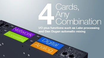 More than 30 types of Mini-YGDAI card can be used with the RSio64-D. Not only I/O cards that handle formats like AES/EBU or ADAT, but processing cards that provide capabilities such as Lake processing and Dan Dugan automatic mixing as well.