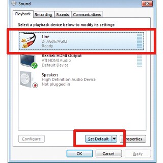 Click [Control Panel] -> [Sound], and then on the [Playback] tab, select [AG06/AG03] and click the [Set Default] button.