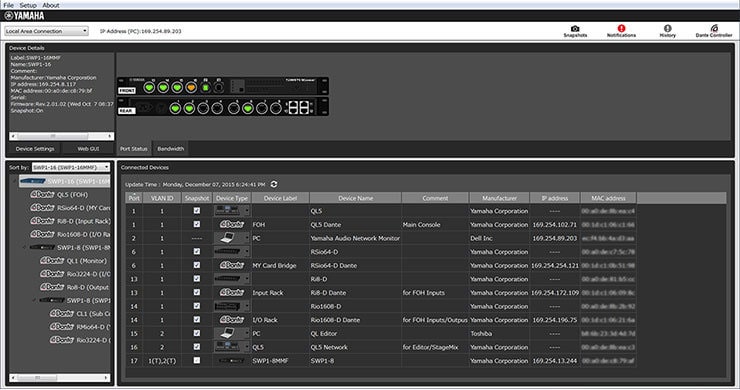 Understanding how multiple switches installed in different locations are connected, plus how network devices are connected to those switches, can be a difficult, time-consuming task. The Yamaha Audio Network Monitor makes overall network topology clearly visible, giving the user a comprehensive overview of how multiple switches and Dante network devices are interconnected. Simply connect a Windows PC to the nearest SWP1 switch and launch the Yamaha Audio Network Monitor software.