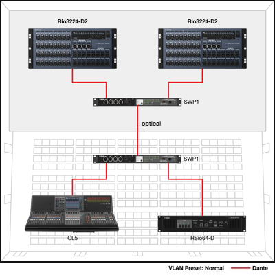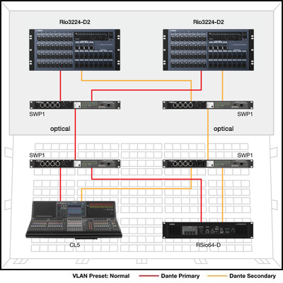 In this example VLAN has been set up on the SWP1 switches, with the Dante primary line assigned to VLAN1 and the secondary line assigned to VLAN2. Only two switches are needed for redundant cable connections. Optional MMF-SWP1 optical modules need to be added to the SWP1 switches to allow optical connections for each line.