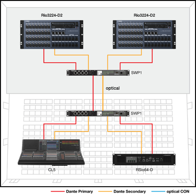 One SWP1 switch is placed on stage and one is located at the FOH position. Optical fiber connection between the switches allows reliable data transmission over distances of up to 300 meters. A computer can be connected to either switch for monitoring and management control of the entire network.