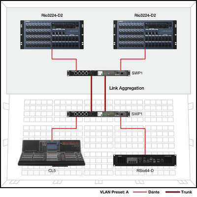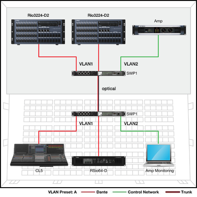 In this case VLAN1 handles the Dante network while VLAN2 hosts an amp monitoring and control network. This isolates and protects amp control from Dante multicast communication.