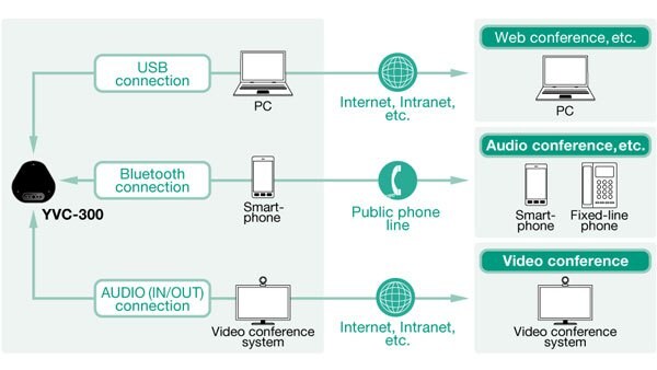 Easily portable and ready for use just by connecting it to a PC via USB, this device lets you quickly start teleconferences even in rooms without facilities. The YVC-300 also automatically optimizes acoustic settings to match the surrounding environment, so you can comfortably hold a teleconference anywhere.