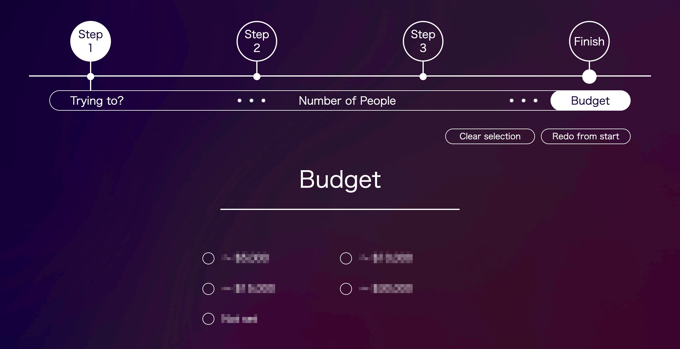 Select the desired budget range and click "Next." Select a budget value for the equipment only, not including setup and installation costs.