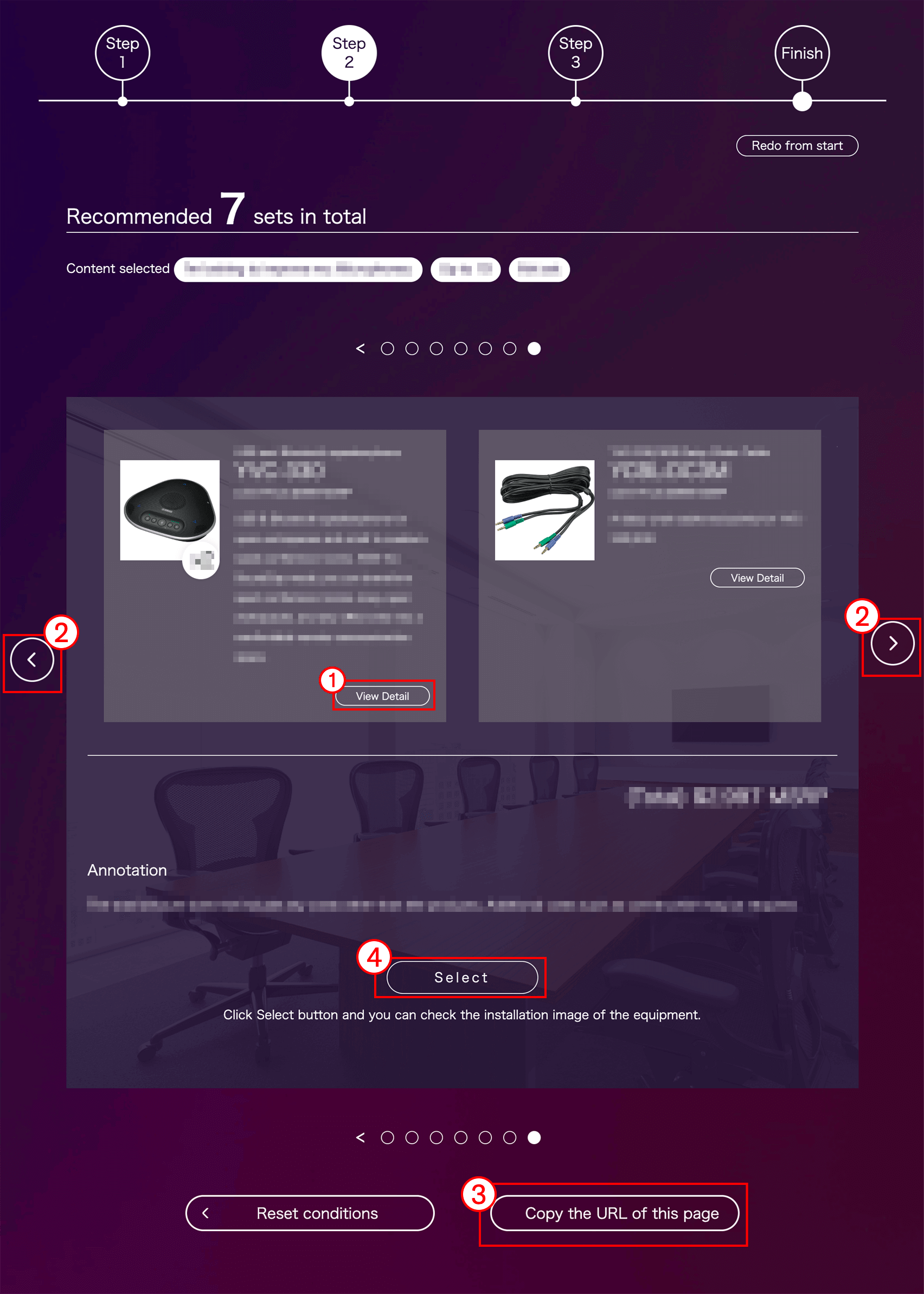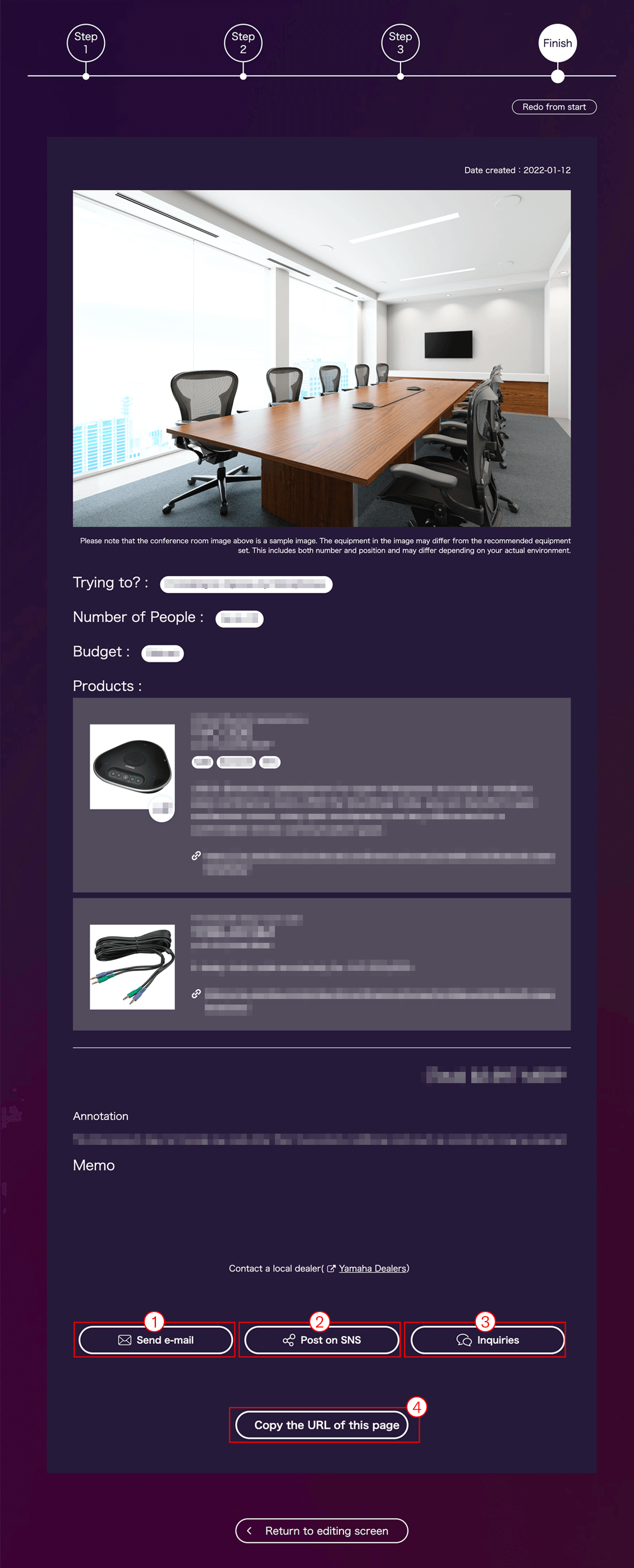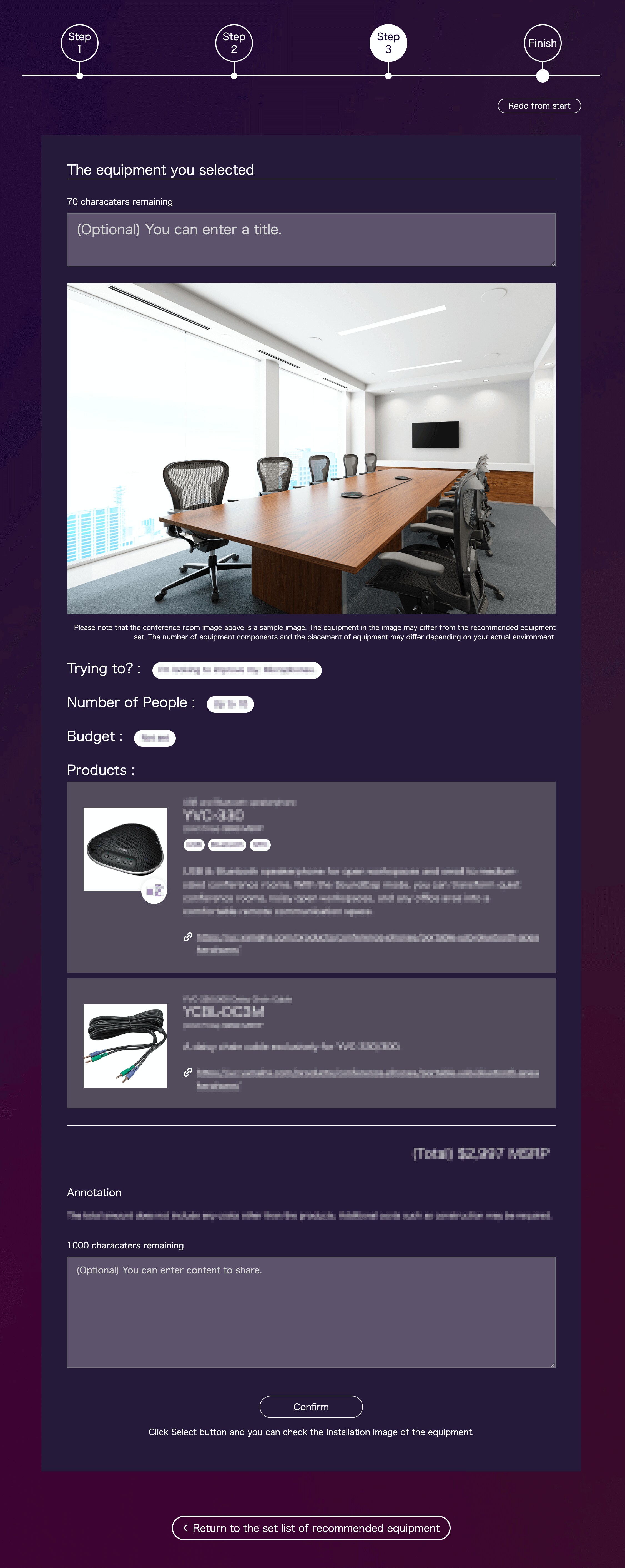 Select the estimated number of people who will use the conference room and then click "Next." Yamaha will recommend a standard room size appropriate to the number of people selected.